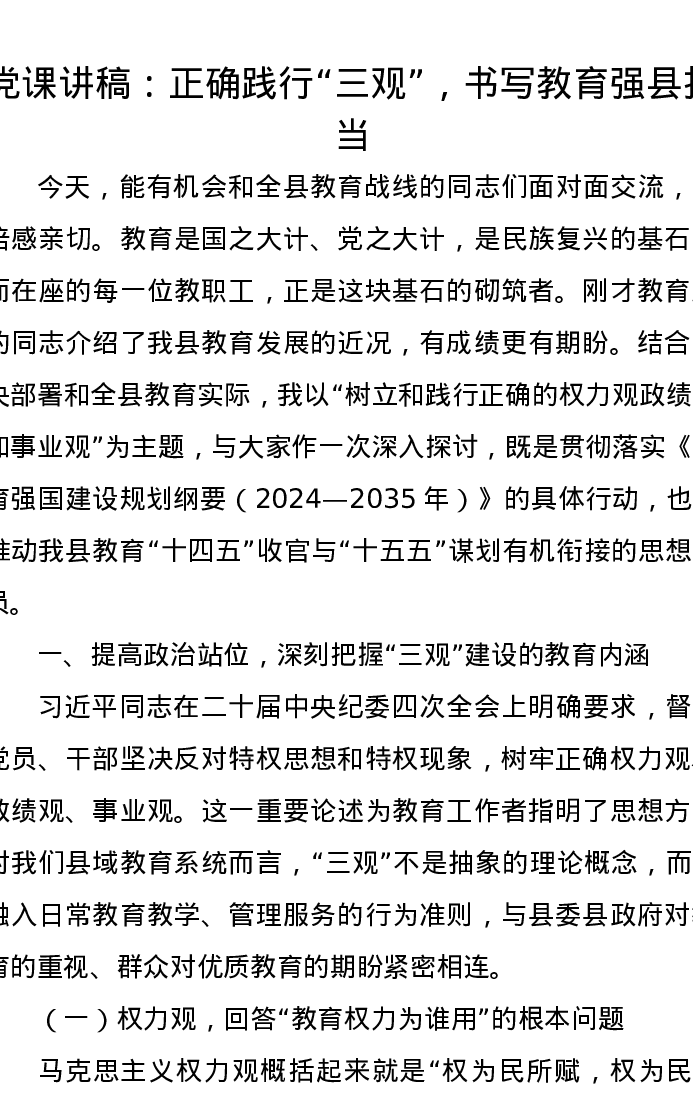 党课讲稿:正确践行“三观”,书写教育强县担当