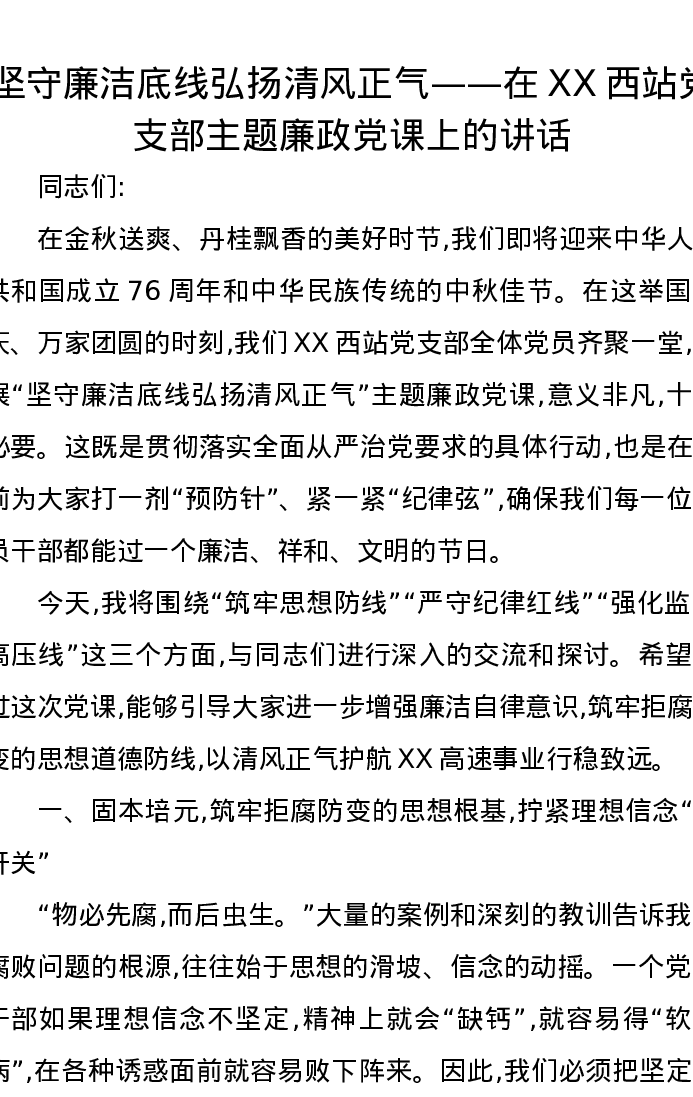 坚守廉洁底线弘扬清风正气——在XX西站党支部主题廉政党课上的讲话