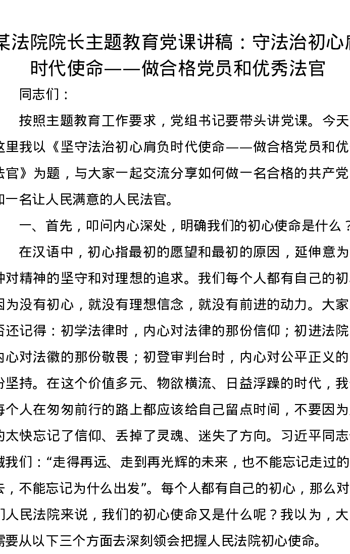 某法院院长主题教育党课讲稿:守法治初心肩时代使命——做合格党员和优秀法官