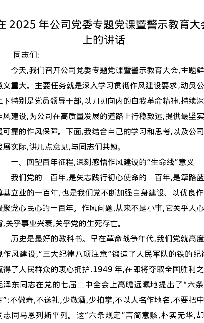 在2025年公司党委专题党课暨警示教育大会上的讲话
