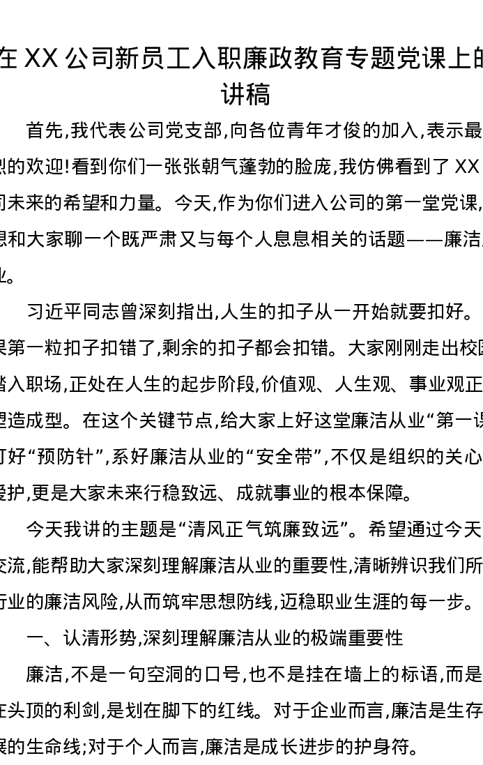 在XX公司新员工入职廉政教育专题党课上的讲稿