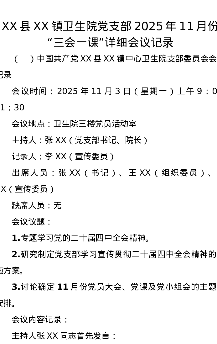 XX县XX镇卫生院党支部2025年11月份“三会一课”详细会议记录
