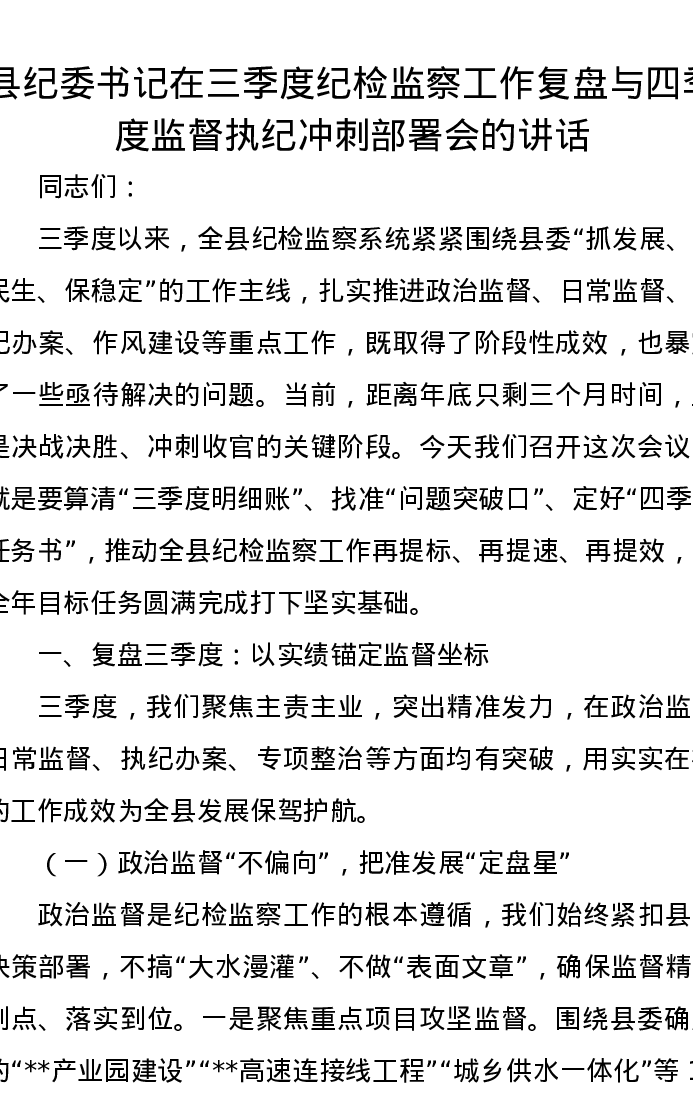 县纪委书记在三季度纪检监察工作复盘与四季度监督执纪冲刺部署会的讲话