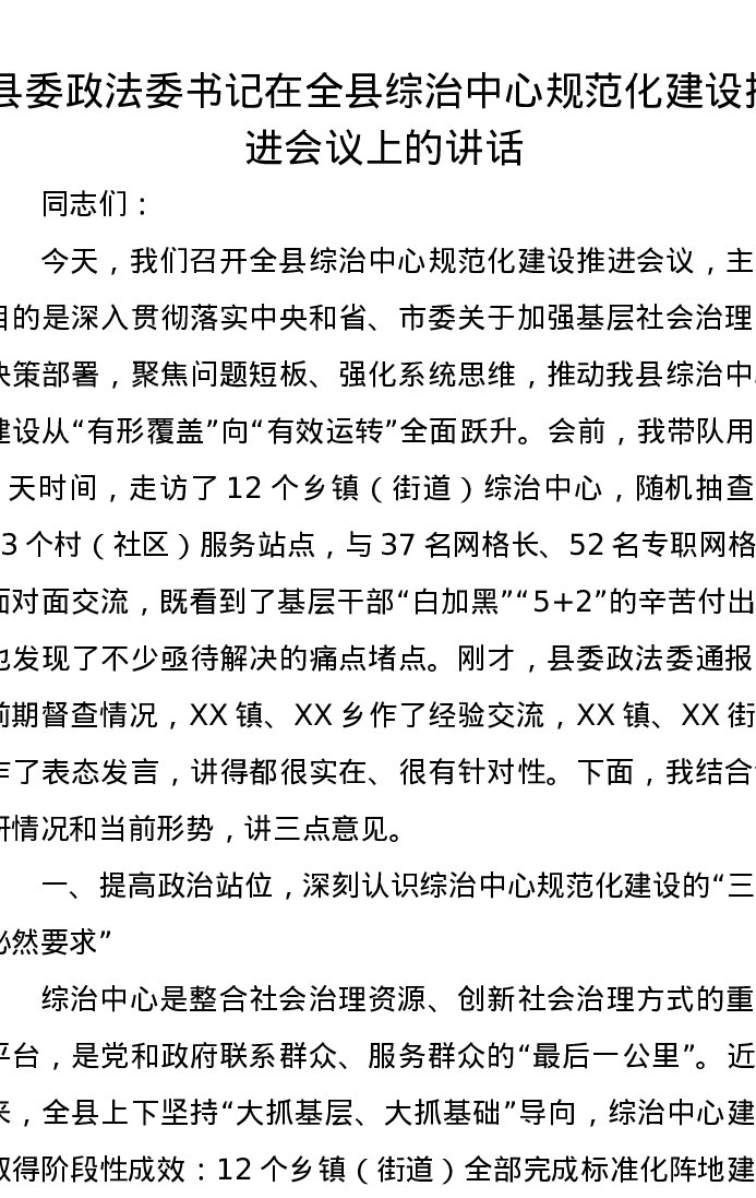县委政法委书记在全县综治中心规范化建设推进会议上的讲话