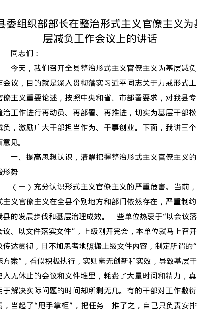 县委组织部部长在整治形式主义官僚主义为基层减负工作会议上的讲话