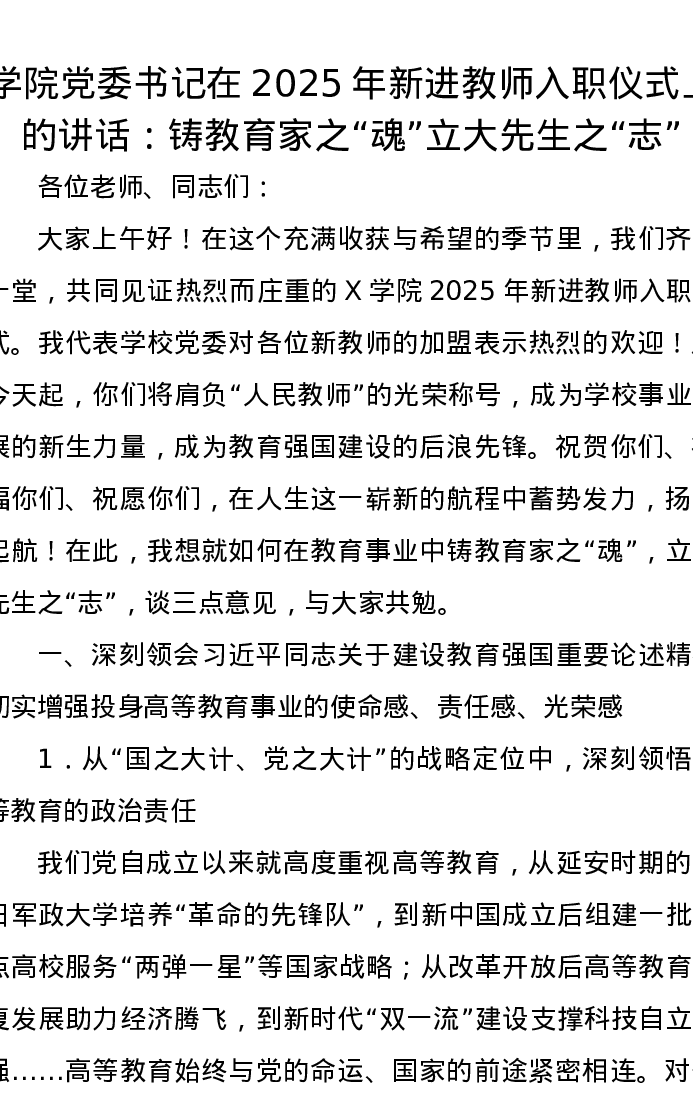 学院党委书记在2025年新进教师入职仪式上的讲话:铸教育家之“魂”立大先生之“志”
