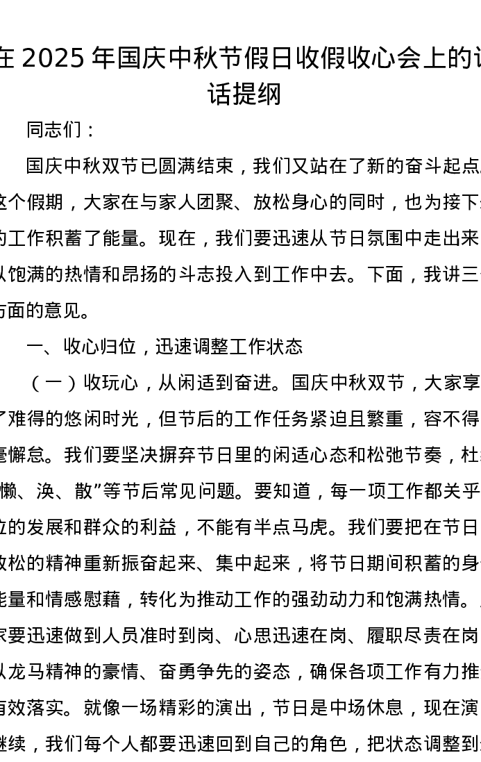 在2025年国庆中秋节假日收假收心会上的讲话提纲