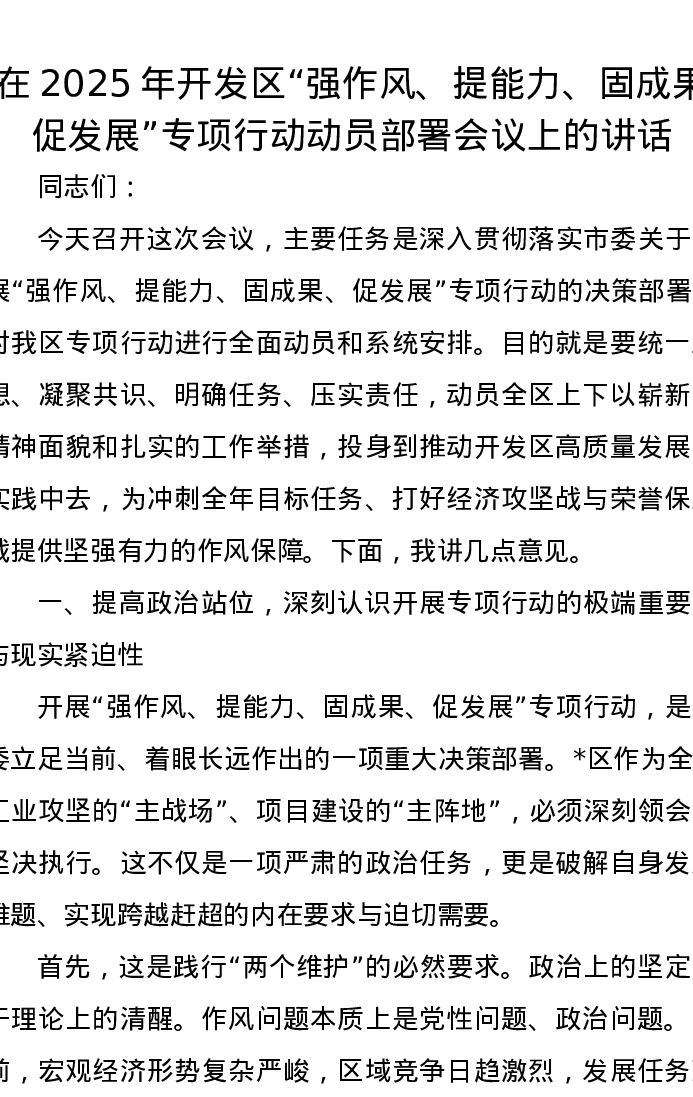 在2025年开发区“强作风、提能力、固成果、促发展”专项行动动员部署会议上的讲话
