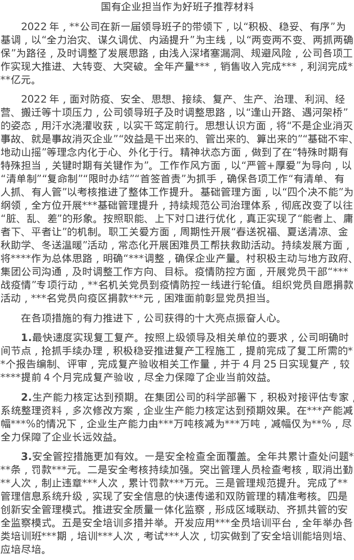 20220721国有企业担当作为好班子推荐材料