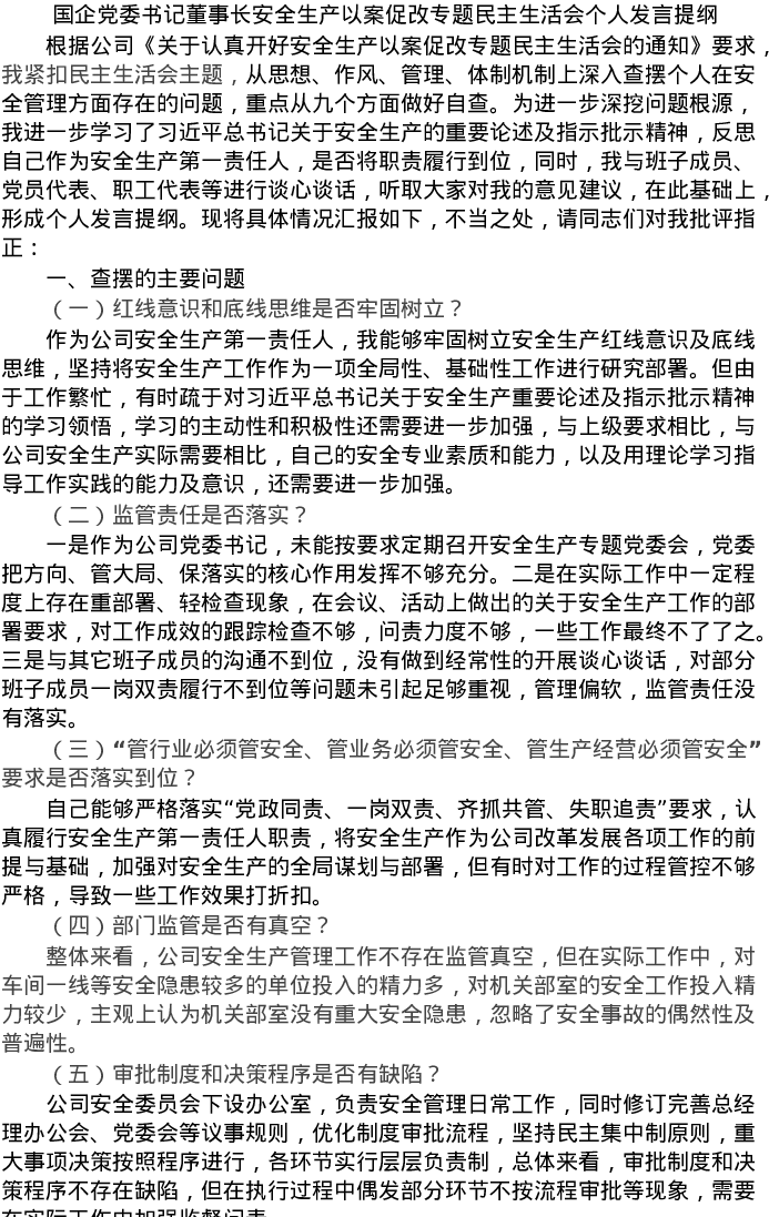 20220722国企党委书记董事长安全生产以案促改专题民主生活会个人发言提纲