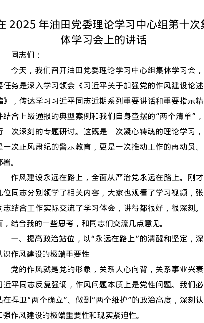 在2025年油田党委理论学习中心组第十次集体学习会上的讲话