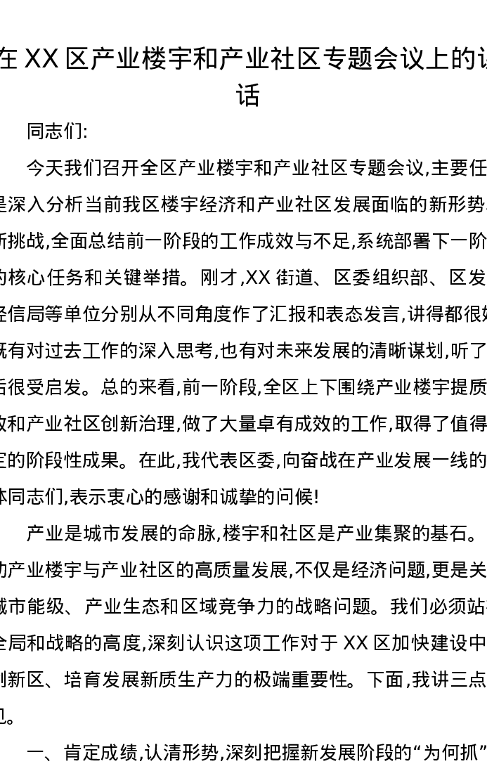在XX区产业楼宇和产业社区专题会议上的讲话