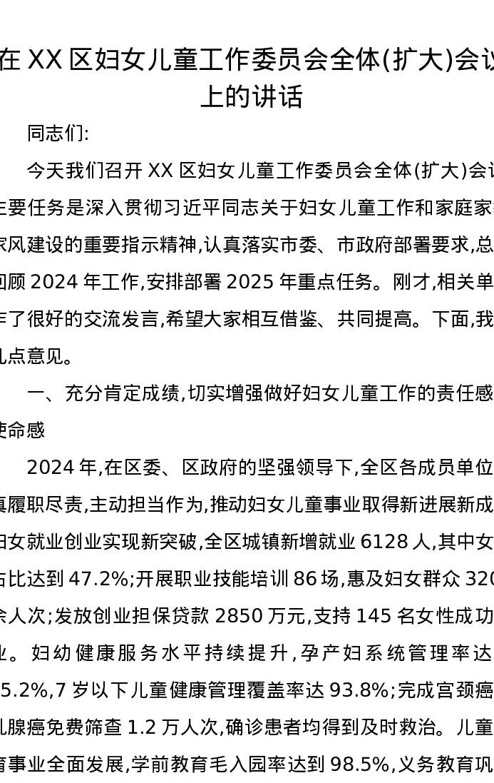 在XX区妇女儿童工作委员会全体(扩大)会议上的讲话