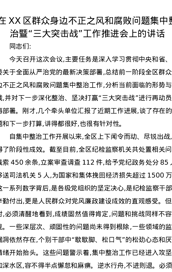 在XX区群众身边不正之风和腐败问题集中整治暨“三大突击战”工作推进会上的讲话