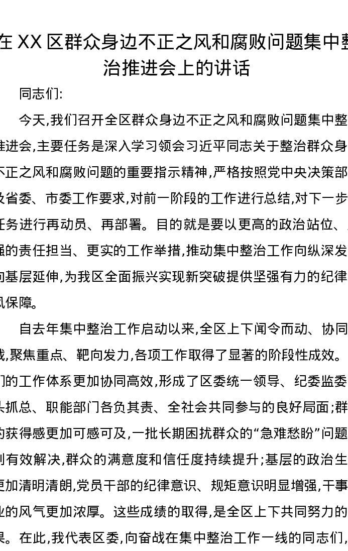 在XX区群众身边不正之风和腐败问题集中整治推进会上的讲话