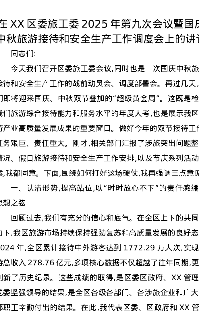 在XX区委旅工委2025年第九次会议暨国庆中秋旅游接待和安全生产工作调度会上的讲话