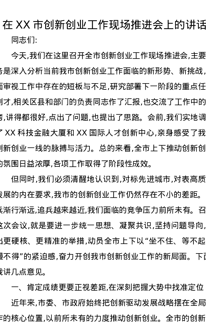 在XX市创新创业工作现场推进会上的讲话