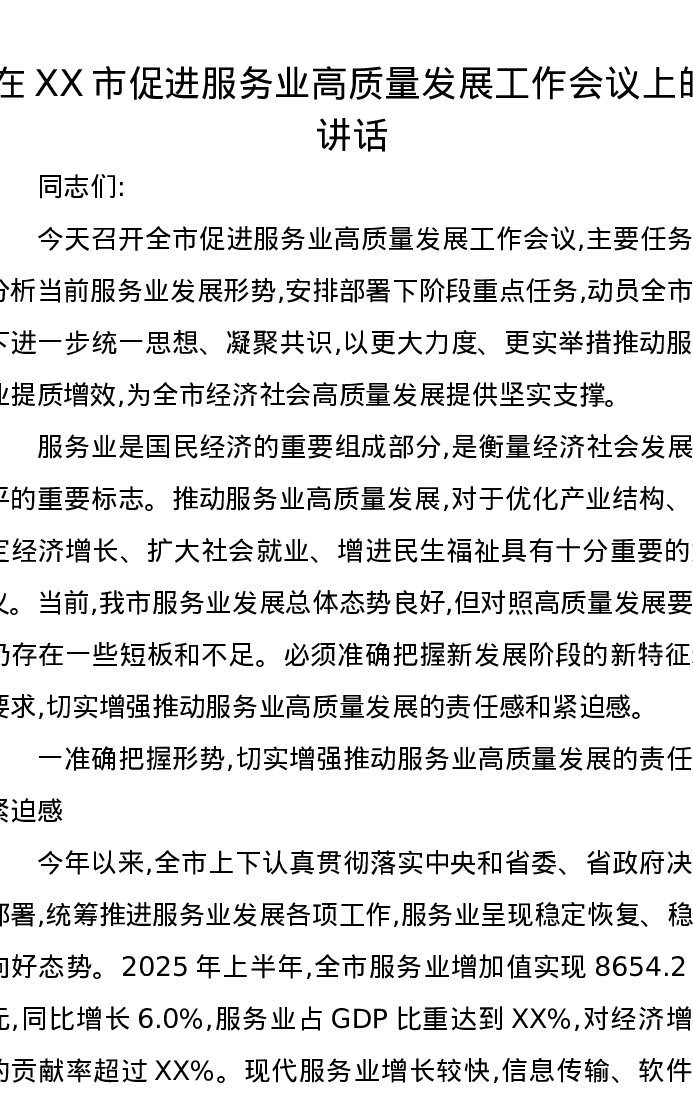 在XX市促进服务业高质量发展工作会议上的讲话