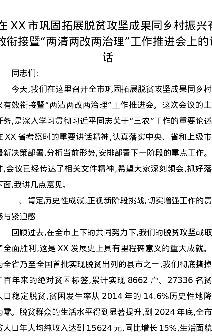 在XX市巩固拓展脱贫攻坚成果同乡村振兴有效衔接暨“两清两改两治理”工作推进会上的讲话