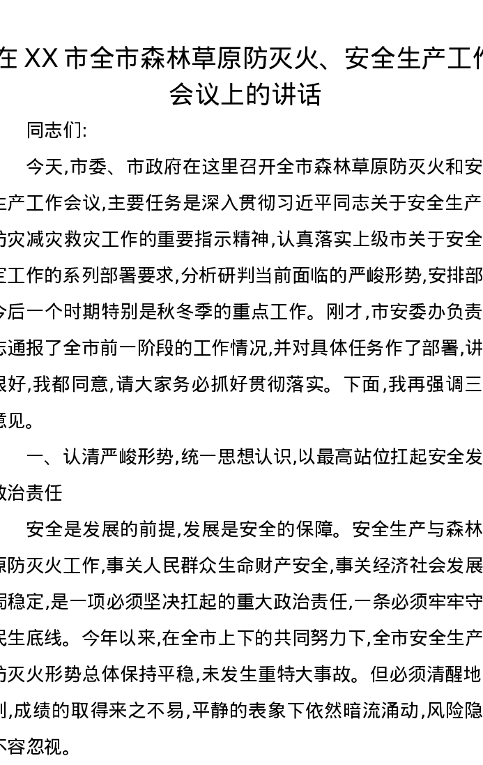 在XX市全市森林草原防灭火、安全生产工作会议上的讲话