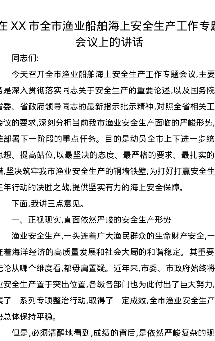 在XX市全市渔业船舶海上安全生产工作专题会议上的讲话