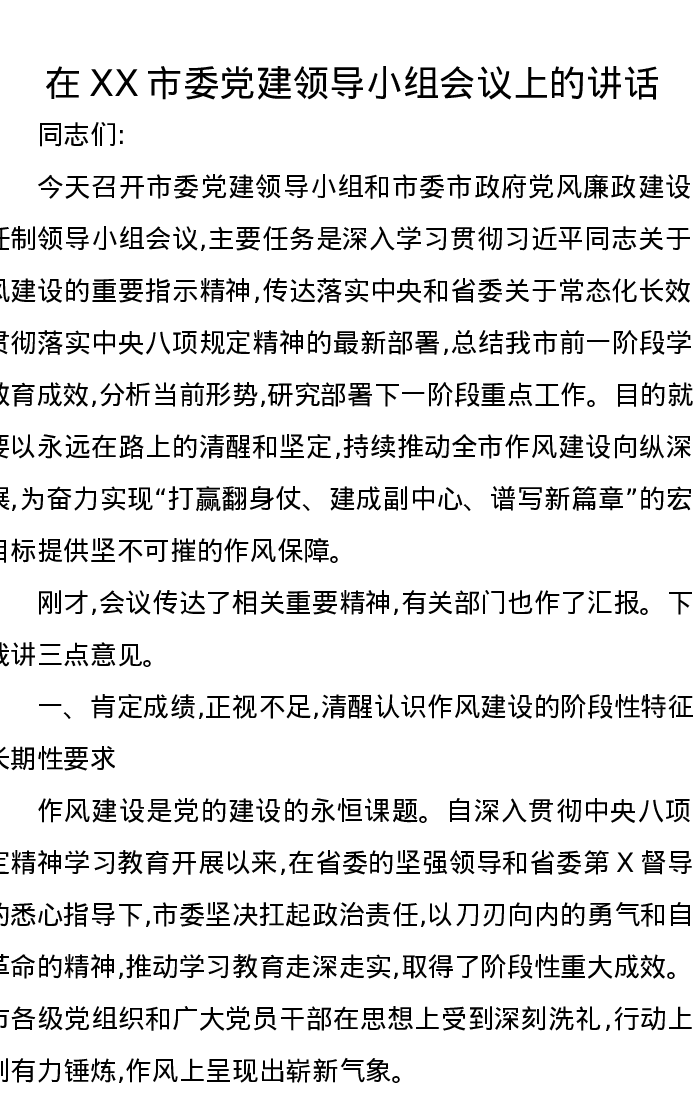 在XX市委党建领导小组会议上的讲话