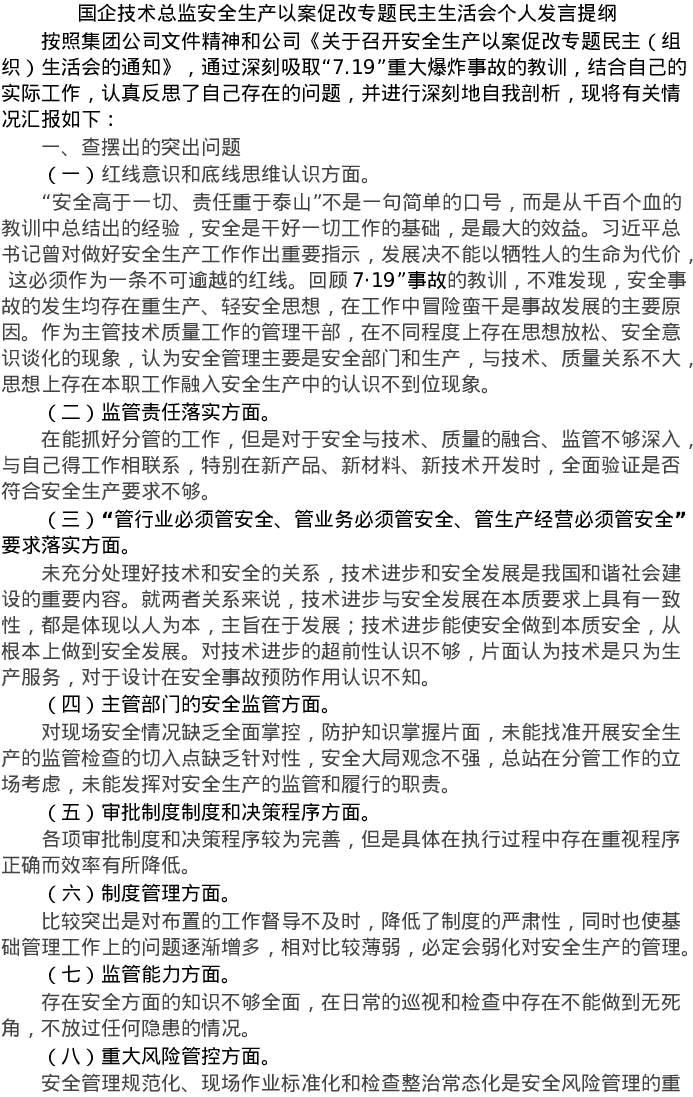20220722国企技术总监安全生产以案促改专题民主生活会个人发言提纲