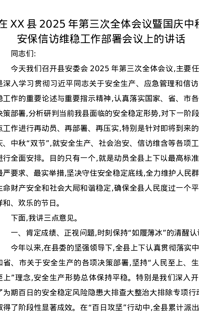 在XX县2025年第三次全体会议暨国庆中秋安保信访维稳工作部署会议上的讲话