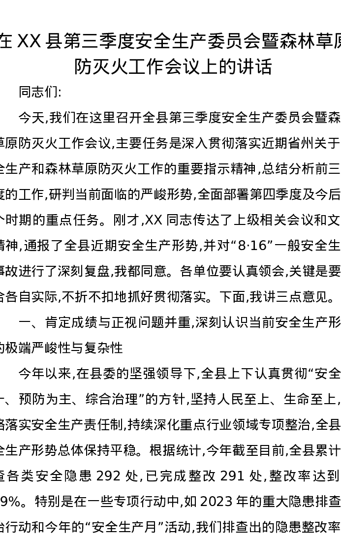 在XX县第三季度安全生产委员会暨森林草原防灭火工作会议上的讲话