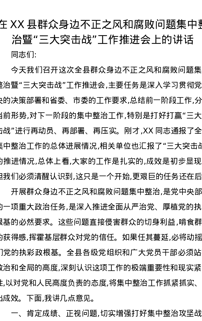 在XX县群众身边不正之风和腐败问题集中整治暨“三大突击战”工作推进会上的讲话