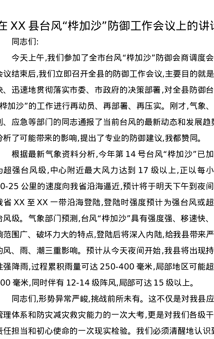 在XX县台风“桦加沙”防御工作会议上的讲话