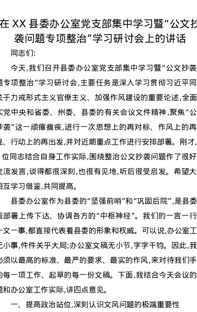 在XX县委办公室党支部集中学习暨“公文抄袭问题专项整治”学习研讨会上的讲话