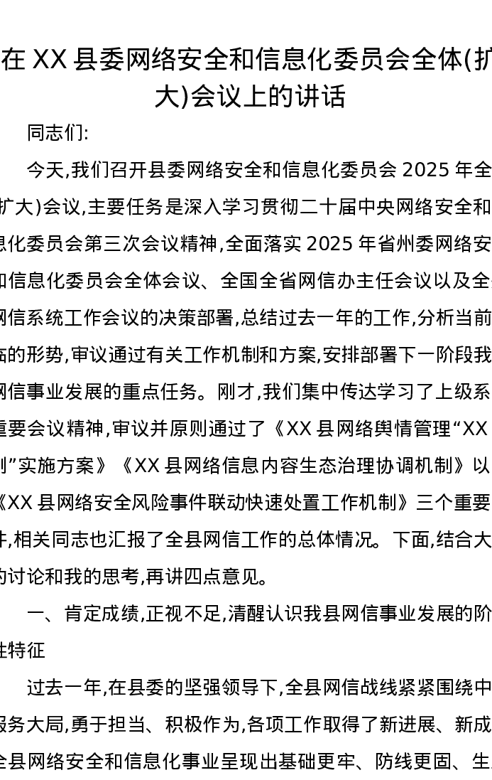 在XX县委网络安全和信息化委员会全体(扩大)会议上的讲话