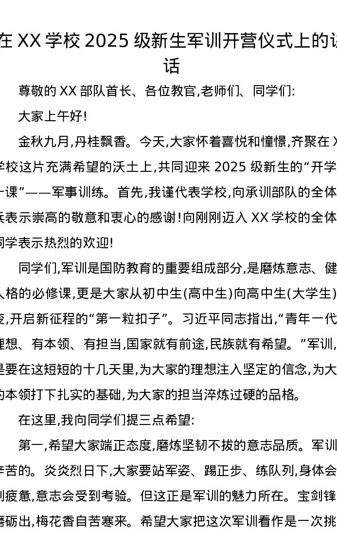 在XX学校2025级新生军训开营仪式上的讲话