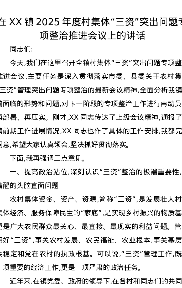在XX镇2025年度村集体“三资”突出问题专项整治推进会议上的讲话