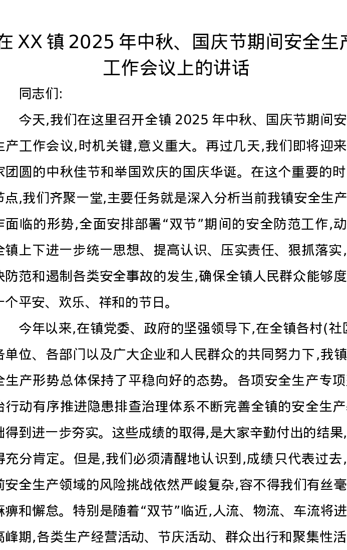 在XX镇2025年中秋、国庆节期间安全生产工作会议上的讲话