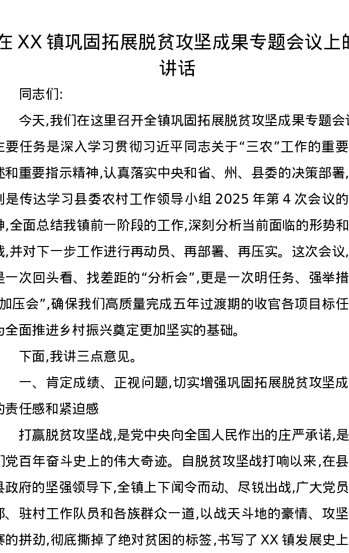 在XX镇巩固拓展脱贫攻坚成果专题会议上的讲话