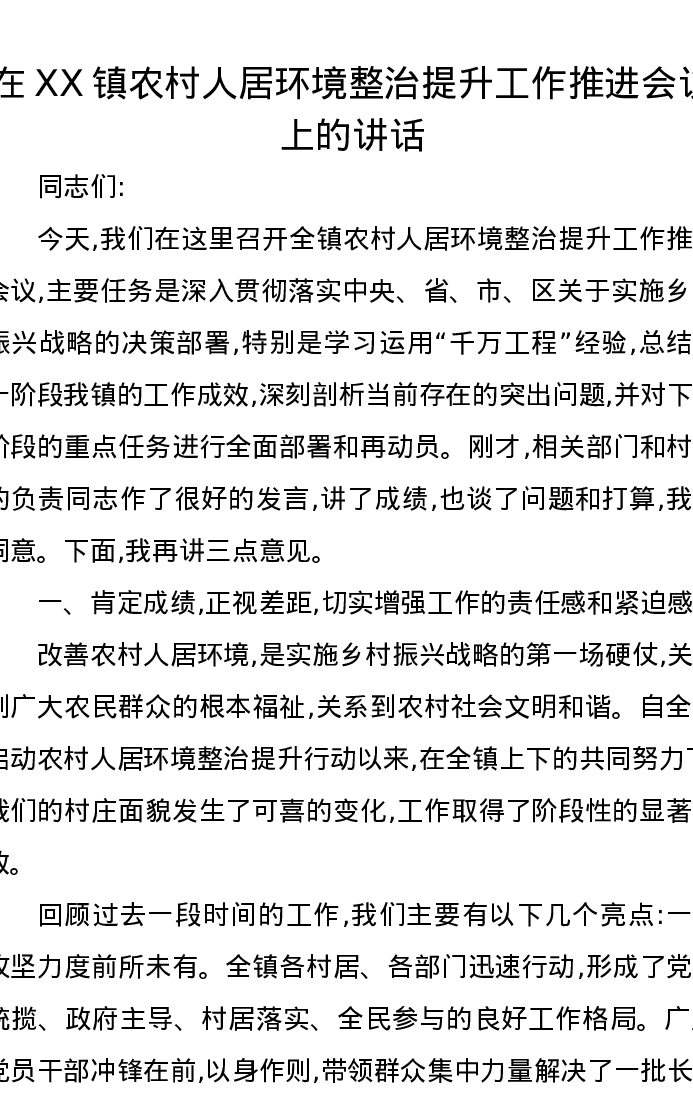 在XX镇农村人居环境整治提升工作推进会议上的讲话