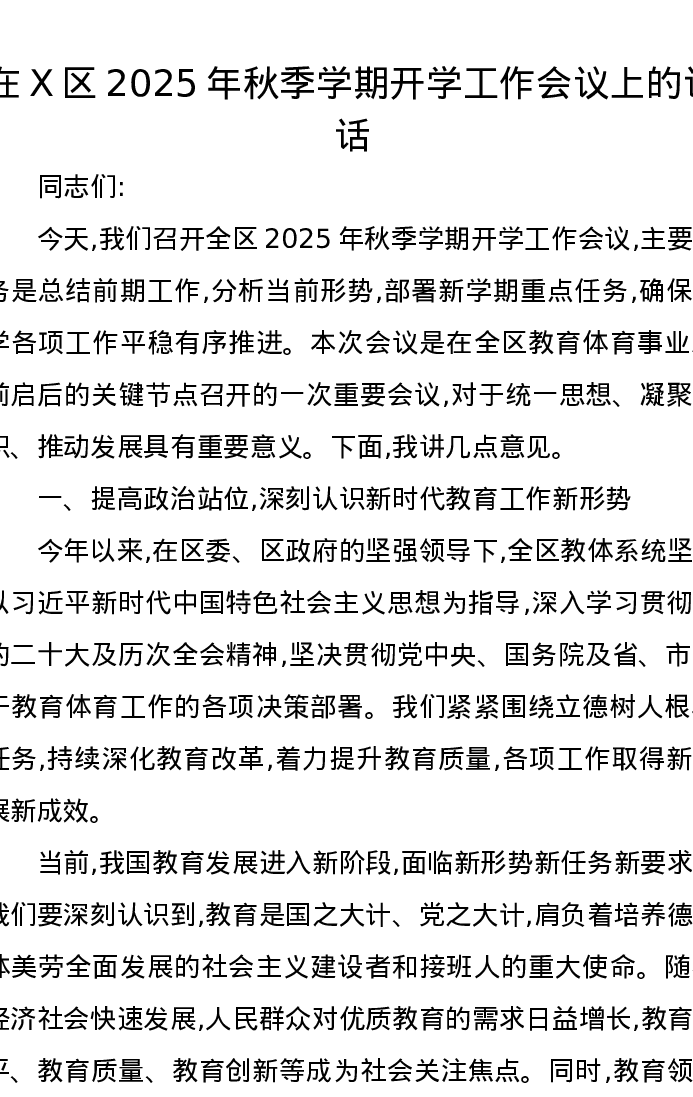 在X区2025年秋季学期开学工作会议上的讲话
