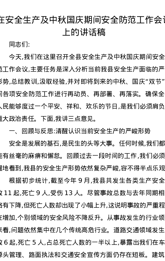 在安全生产及中秋国庆期间安全防范工作会议上的讲话稿