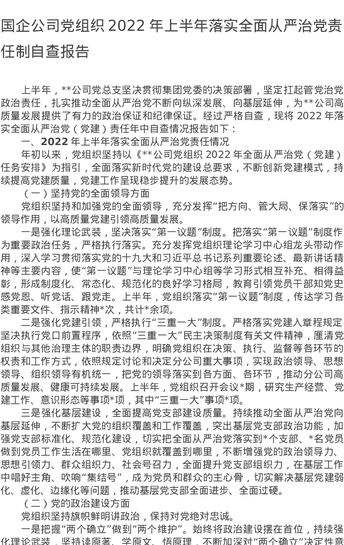 20220728国企公司党组织2022年上半年落实全面从严治党责任制自查报告