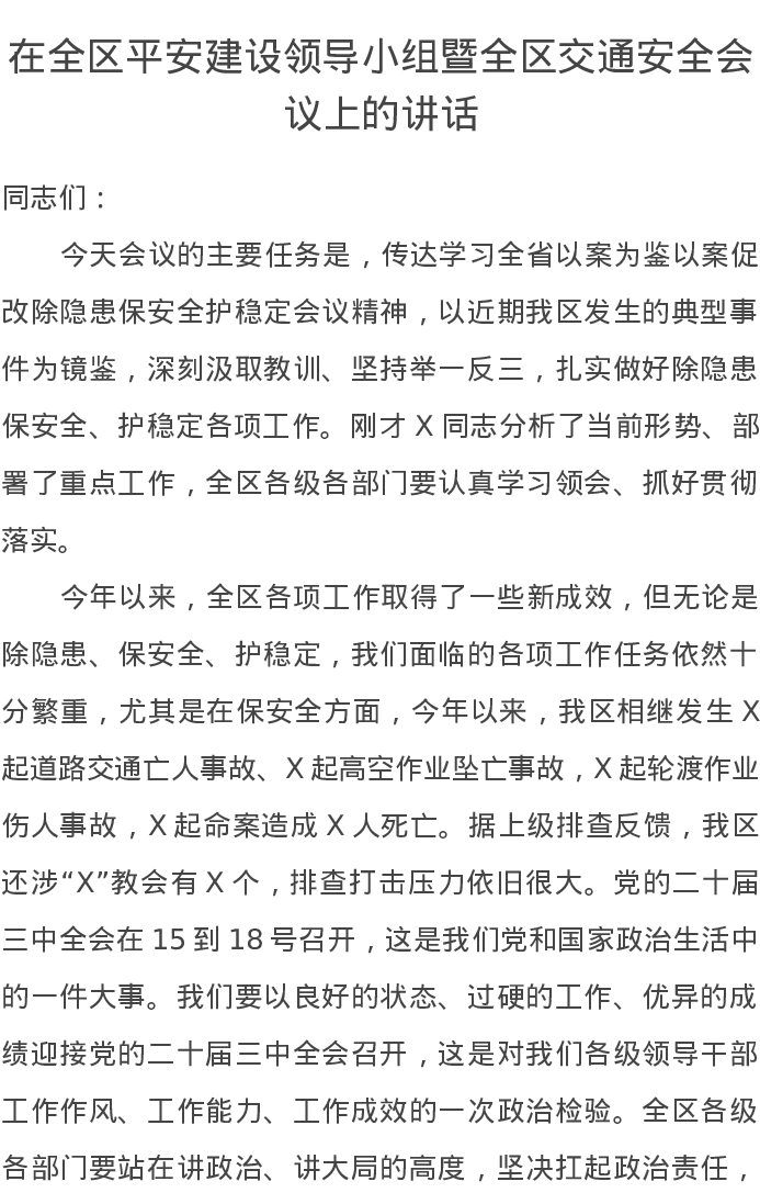 在全区平安建设领导小组暨全区交通安全会议上的讲话