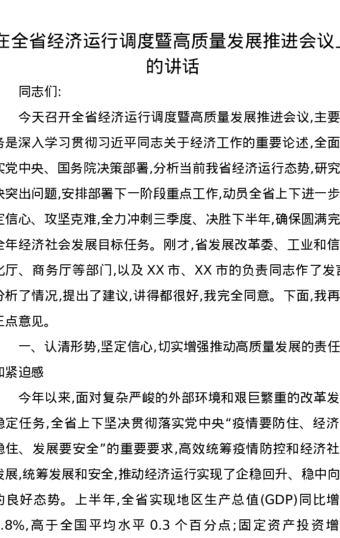 在全省经济运行调度暨高质量发展推进会议上的讲话