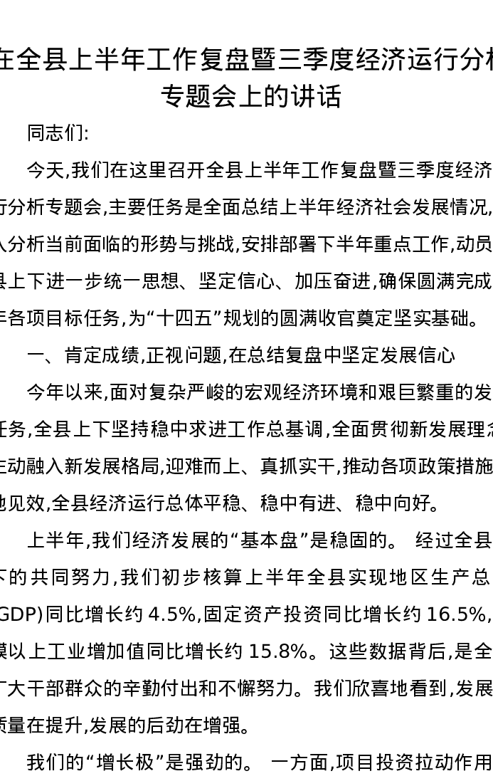 在全县上半年工作复盘暨三季度经济运行分析专题会上的讲话