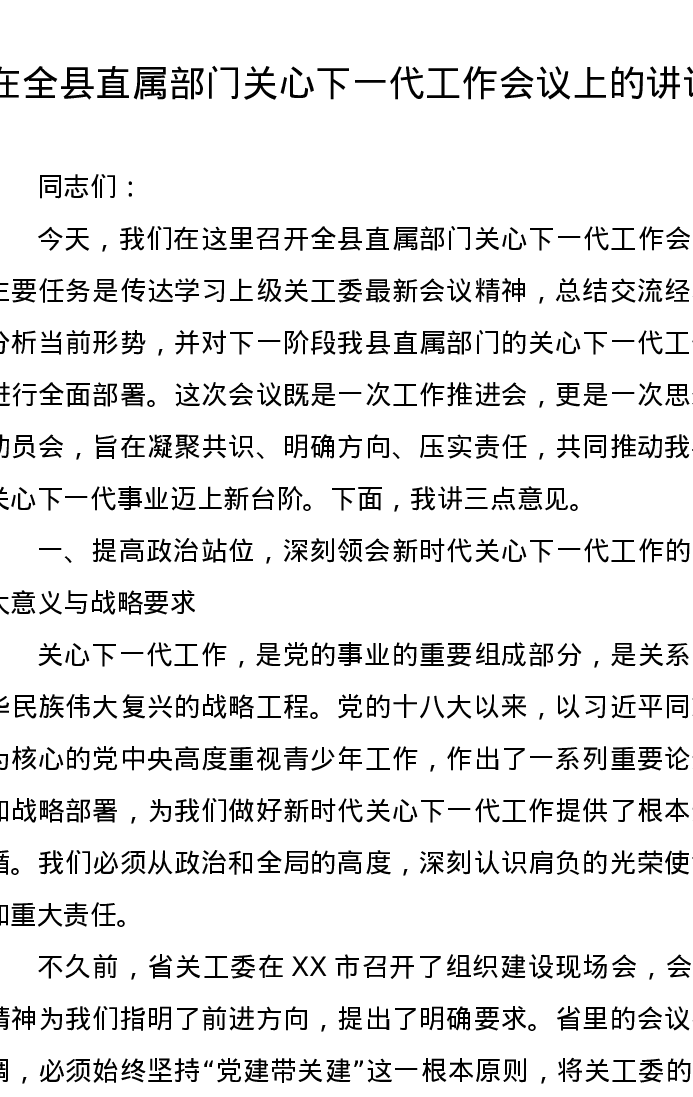 在全县直属部门关心下一代工作会议上的讲话