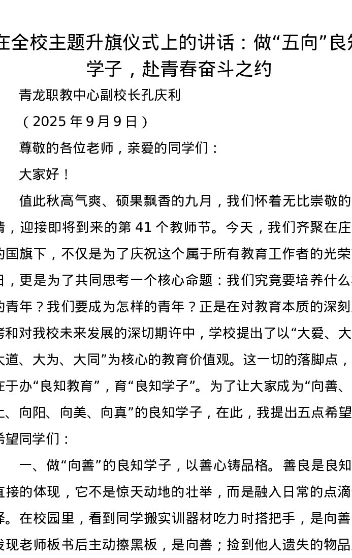 在全校主题升旗仪式上的讲话:做“五向”良知学子,赴青春奋斗之约