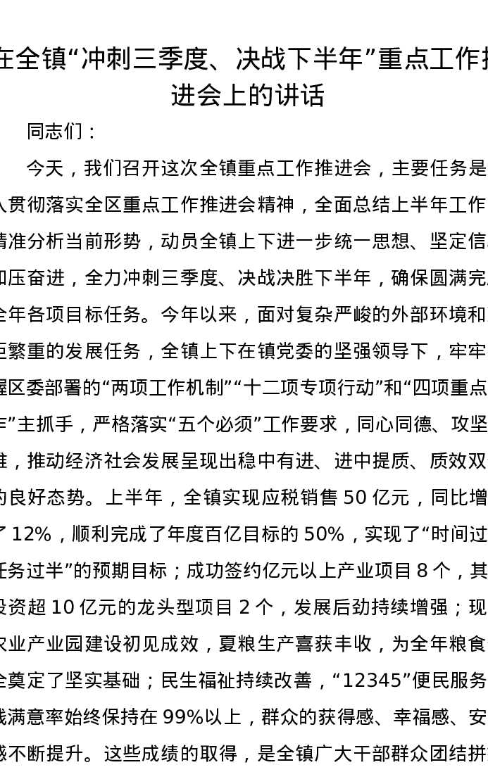 在全镇“冲刺三季度、决战下半年”重点工作推进会上的讲话