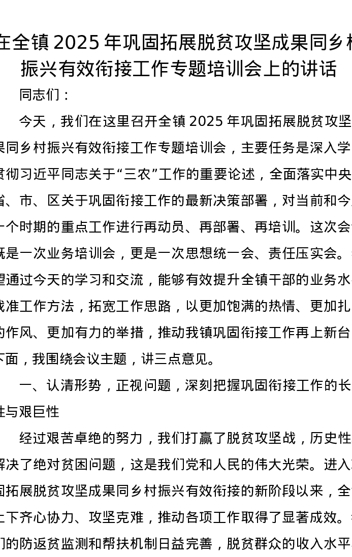 在全镇2025年巩固拓展脱贫攻坚成果同乡村振兴有效衔接工作专题培训会上的讲话