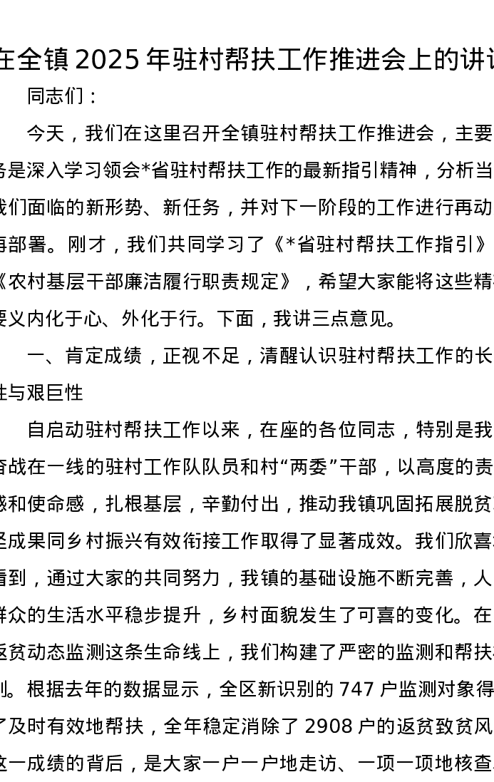 在全镇2025年驻村帮扶工作推进会上的讲话