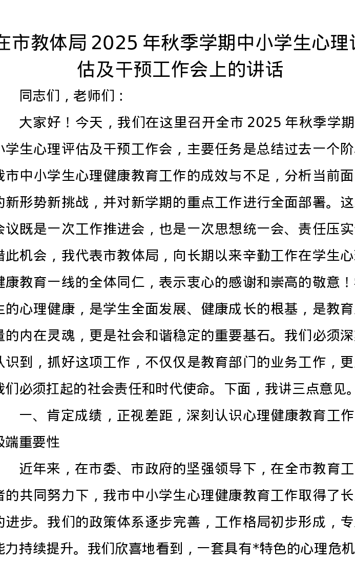 在市教体局2025年秋季学期中小学生心理评估及干预工作会上的讲话